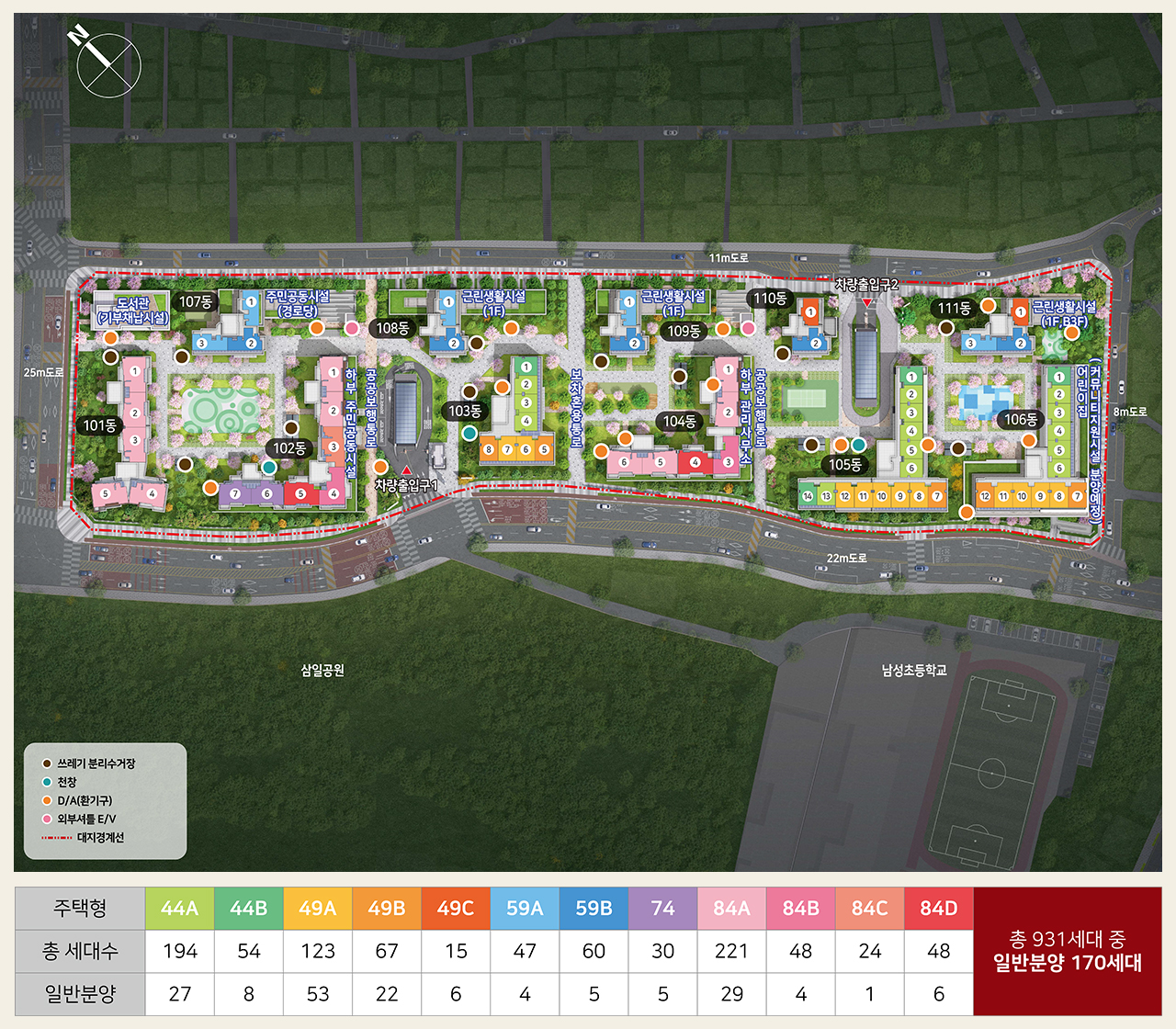 ※ 배치도 내 단지 경계선 및 방위표는 CG상의 표현으로 실제와 다소 차이가 있을 수 있으며, 구획선 및 시설물의 위치, 근린생활시설(상가), 규모 등은 측정결과 및 각종 기관의 평가에 따라 실 시공시 다소 변경될 수 있습니다.
