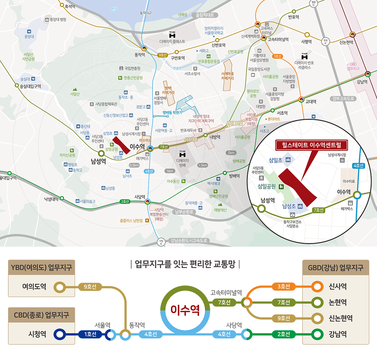 ■ 4·7호선 이수역과 남성역, 남부순환로, 올림픽대로, 강남순환도로 등 쾌속 교통