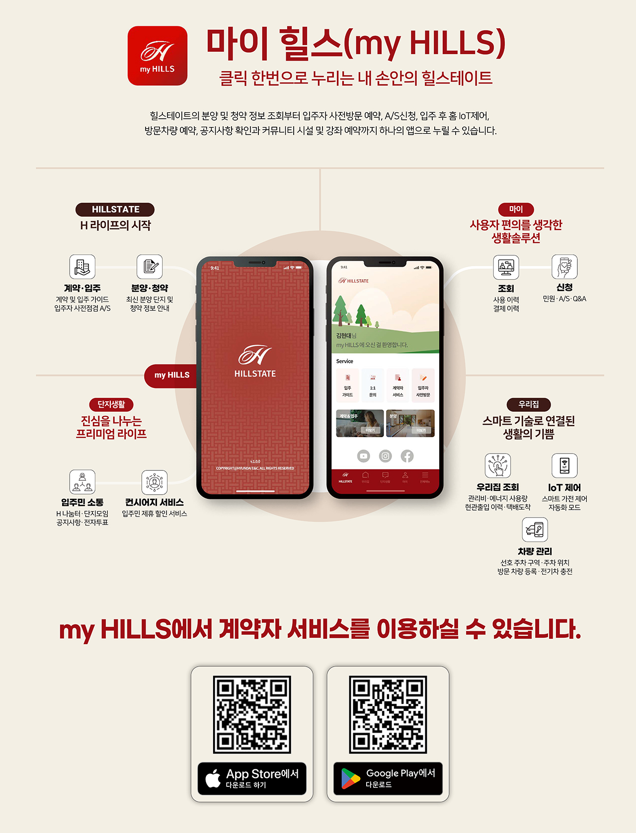※ 마이 힐스(my Hills) 서비스는 성능 개선이나 입주 시의 기술개발 환경 등의 사유로 제공되는 서비스의 내용이 변경될 수 있으며, 입주 후 플랫폼 운영사의 정책에 따라 사용요금이 발생할 수 있습니다.