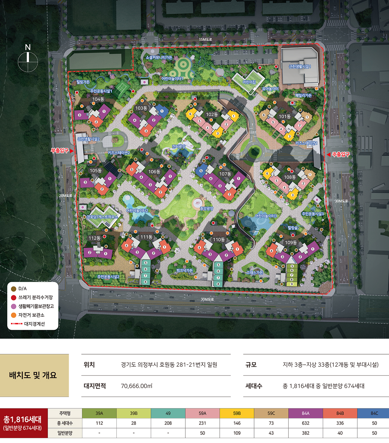 ※ 배치도 내 단지 경계선 및 방위표는 CG상의 표현으로 실제와 다소 차이가 있을 수 있으며, 구획선 및 시설물의 위치, 근린생활시설(상가), 규모 등은 측정결과 및 각종 기관의 평가에 따라 실 시공시 다소 변경될 수 있습니다.