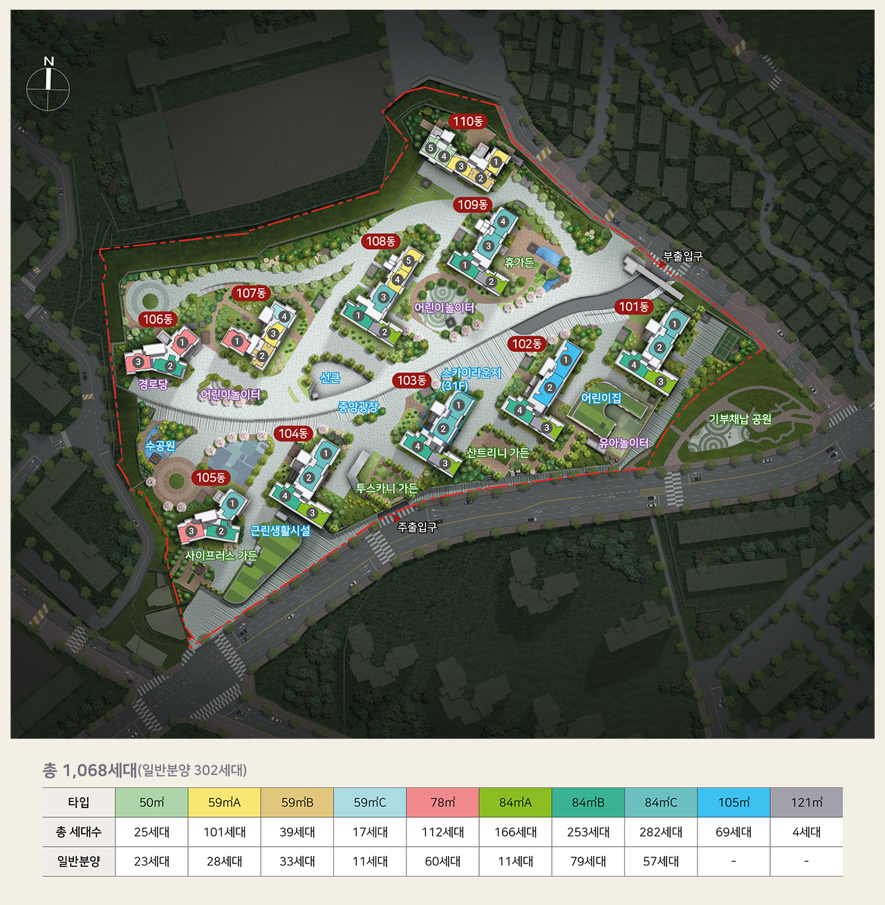 ※ 배치도 내 단지 경계선 및 방위표는 CG 상의 표현으로 실제와 다소 차이가 있을 수 있으며, 구획선 및 시설물의 위치, 규모 등은 측정 결과 및 각종 기관의 평가에 따라 실 시공 시 다소 변경될 수 있습니다.