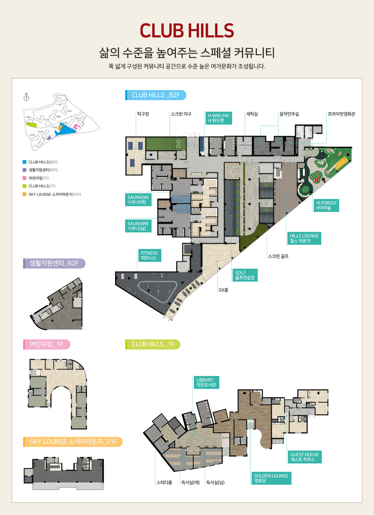 ※ 부대시설 일체의 운영 및 유지관리는 입주민이 자체적으로 해야 하며, 커뮤니티 공간 내 운동기구, 옷장(락카)은 기본 제공되며, 작은도서관, 골프연습장, 스크린골프, 어린이집, 경로당 등의 시설관리 및 운영을 위한 가구, 비품, 스탠드, 각종 집기류는 제공되지 않습니다.
