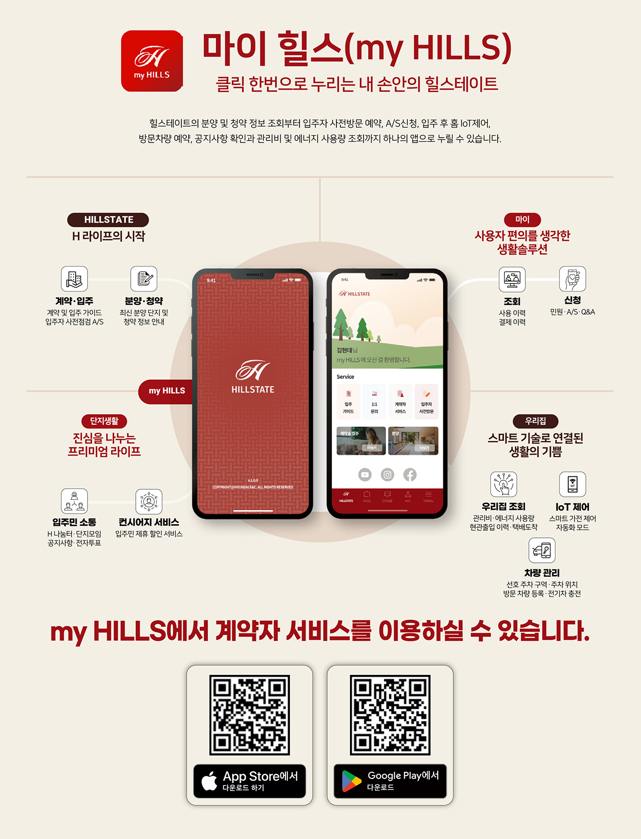※마이 힐스(my Hills) 서비스는 성능 개선이나 입주 시의 기술 개발 환경 등의 사유로 제공되는 서비스의 내용이 변경될 수 있으며, 입주 후 플랫폼 운영 사의 정책에 따라 사용요금 및 사용 제한이 발생할 수 있습니다.
