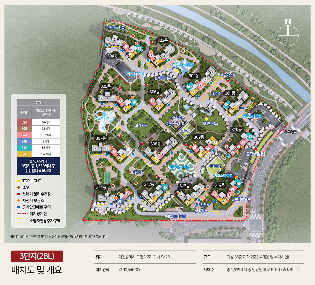 ※ 3단지 서측 304동과 305동 사이에 계획된 차량 부출입구는 대전시「도안 2-2지구 SA2블럭 공동주택 신축공사 교통영향평가 심의결과」 (“사업지 준공 승인시까지 서측 출입구 개설”)에 따라 계획된 시설로서 향후 서남부 종합스포츠타운 조성사업에 따른 신설도로에 연결예정이나, 서남부 종합스포츠타운 조성사업의 개발계획변경 및 국토부의 개발계획 승인여부, 사업 시행 시기 차이 등으로 인하여 해당 부출입구의 삭제 및 계획변경 또는 본 사업의 준공전 미개설, 장기적 또는 영구적 미개설될 수 있으니, 이를 반드시 인지하고 청약 및 계약하여야 합니다.